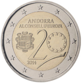Al Dritto è raffigurato lo stemma del Principato di Andorra a sinistra, seguito dal numero 20 (lo zero del numero contiene al suo interno le 12 stelle dell'Unione Europea). Nella parte superiore è impressa l'iscrizione "ANDORRA AL CONSELL D'EUROPA", su due righe, mentre in basso sono presenti: a sinistra il millesimo di conio e a destra un tratto curvo. Sulla parte esterna 12 stelle a cinque punte, simbolo dell'Unione Europea. Al Verso la nuova faccia comune delle monete in Euro, con la scritta 2 euro ed i confini dell'Europa, allargati includendo i nuovi stati aderenti all'Unione, parzialmente ricadenti su sfondo a sei linee verticali delimitate da 2 stelle ciascuna.
