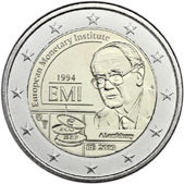 Al Dritto è raffigurato, sulla destra, il ritratto del primo presidente dell'IME, Alexandre Lamfalussy. Subito sotto l'effigie è inciso il nome dell'economista "A. Lamfalussy" e, ancora più in basso, si notano la sigla "BE" (che identifica il Belgio) ed il millesimo di conio. In alto, nella parte sinistra della moneta, adiacente al bordo interno, è impressa l'iscrizione circolare "European Monetary Institute" con sottostanti il simbolo del direttore della zecca belga (che corrisponde allo stemma del comune di Herzele) e il segno della zecca di Utrecht. Al centro, tra l'iscrizione ed il ritratto, si trova l'anno "1994" (anno di creazione dell'Istituto e di conseguente nomina di Lamfalussy), seguito in basso dalla scritta "EMI" (di dimensioni maggiori). Subito sotto l'acronimo, sono rappresentate alcune monete, poste una sopra l'altra, con le seguenti incisioni: il simbolo dell'Euro, la scritta "ECU" e l'abbreviazione della precedente valuta nazionale belga "BEF". A destra, adiacenti al ritratto, si notano le iniziali dell'autore "LL". Sulla parte esterna le 12 stelle a cinque punte, simbolo dell'Unione Europea. Al Verso la nuova faccia comune delle monete in Euro, con la scritta 2 euro ed i confini dell'Europa, allargati includendo i nuovi stati aderenti all'Unione, parzialmente ricadenti su sfondo a sei linee verticali delimitate da 2 stelle ciascuna.