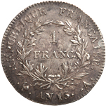Al Dritto è raffigurato il busto di Napoleone Bonaparte, volto verso destra. Lungo il contorno si trovano l'iscrizione circolare "NAPOLEON EMPEREUR." e, in basso, la firma dell'incisore "Tiolier"; più all'esterno è presente una serie di punti. Al Verso si trova al centro la scritta, su due righe, indicante il valore "1 FRANC.", racchiusa da una corona formata da due rami d'alloro. Lungo il contorno sono presenti: in alto la scritta circolare "REPUBLIQUE FRANÇAISE.", in basso il millesimo di conio (per gli anni 1803-1805 il millesimo è espresso in anni trascorsi dalla proclamazione della Prima Repubblica, preceduto dalla scritta "AN"), a sinistra il simbolo del direttore della zecca e a destra il segno di zecca, il quale può essere relativo ad una delle seguenti sedi: