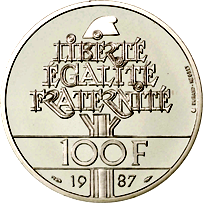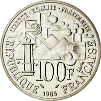 Al Dritto, in primo piano, è rappresentato il Pantheon di Parigi, con subito sotto la scritta "AUX GRANDS HOMMES LA PATRIE RECONNAISSANTE". Lungo il contorno si trovano: in basso il millesimo di conio, racchiuso tra il simbolo del direttore della zecca e quello dell'incisore capo, mentre in alto ai due lati sono poste le scritte ad arco "REPUBLIQUE" e "FRANÇAISE". Ancora più esternamente si può notare un motivo costituito da una serie di punti alternati a delle linee. Al Verso si trova, al centro della moneta, il disegno dell'albero della vita, racchiuso in un esagono simboleggiante i confini della nazione. Sovrapposta al disegno è posta l'indicazione del valore "100 F", mentre lungo il contorno è impressa l'iscrizione circolare "LIBERTE • EGALITE • FRATERNITE". Ancora più esternamente si può notare un motivo costituito da una serie di punti alternati a delle linee.