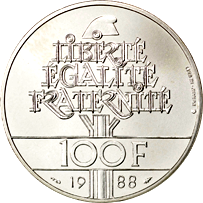 Al Dritto è raffigurato il ritratto di René Descartes (filosofo e matematico francese, 1596-1650), con i capelli che terminano, sul lato sinistro, con una pila di libri e, sul lato destro, con una pergamena. Lungo il contorno, nella parte superiore della moneta, è impressa l'iscrizione circolare "LIBERTE EGALITE FRATERNITE", mentre nella parte inferiore è presente la scritta "DESCARTES", con sottostante il millesimo di conio. Al Verso è rappresentata una mano, indicante una pergamena circondata dalle 12 stelle dell'Unione Europea. In alto, lungo il contorno, si trova la scritta ad arco "REPUBLIQUE FRANÇAISE", mentre in basso, sotto il disegno, è posizionata l'indicazione del valore "100 F", racchiusa tra il simbolo del direttore della zecca e quello dell'incisore capo. Subito sotto il valore, si può notare la firma dell'incisore "A. GAL".