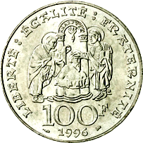 Al Dritto è raffigurato il busto, drappeggiato e corazzato, del re dei franchi Clodoveo I (466 - 511), visto dall'alto, mentre impugna nella mano destra una lancia. Lungo il contorno, nella parte inferiore della moneta, è impressa l'iscrizione circolare "CLOVIS ROI DES FRANCS", mentre ai lati sono incise le scritte ad arco "RÉPUBLIQUE", a sinistra, e "FRANÇAISE", a destra. Al Verso, al centro della moneta, è rappresentato il battesimo del re Clodoveo I da parte di San Remigio (si nota inoltre la figura di un altro santo), nella cattedrale di Reims; adiacente al personaggio sulla destra, all'altezza dei piedi, si nota il simbolo della zecca di Pessac. Lungo quasi l'intero contorno è impressa la scritta circolare "LIBERTÉ : ÉGALITÉ : FRATERNITÉ". Nella parte inferiore è presente l'indicazione del valore, "100 F" (la lettera "F" è scritta in caratteri più piccoli), con sottostante il millesimo di conio racchiuso tra tra il simbolo del direttore della zecca a sinistra e quello dell'incisore capo a destra.