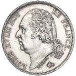 Al Dritto è raffigurato il busto del Re Luigi XVIII di Francia, volto verso sinistra. Lungo il contorno si trovano l'iscrizione circolare "LOUIS XVIII ROI DE FRANCE." e, in basso, la firma dell'incisore "MICHAUT F." con sottostante il simbolo dell'incisore capo; più all'esterno è presente una serie di punti. Al Verso si trovano al centro lo stemma coronato della casata dei Borbone, a sinistra la scritta indicante il valore "1" e a destra la lettera "F" (la seconda parte dell'indicazione del valore), il tutto racchiuso da una corona formata da due rami di alloro. In basso, al di fuori della corona, è presente il millesimo di conio con a sinistra il simbolo del direttore della zecca e a destra il segno di zecca, il quale può essere relativo ad una delle seguenti sedi: