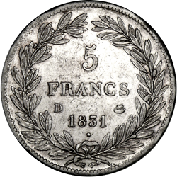Al Dritto è raffigurato il busto coronato del Re Luigi Filippo di Francia, volto verso destra. Lungo il contorno si trovano l'iscrizione circolare "LOUIS PHILIPPE I ROI DES FRANÇAIS" (queste monete si distinguono da quelle del tipo precedente per lo spazio aumentato tra la E di Philippe e la I di primo) e, in basso, la firma dell'incisore "DOMARD.F."; più all'esterno è presente una serie di punti. Al Verso si trova al centro l'indicazione del valore "5 FRANCS", scritta su due righe con sottostante il millesimo di conio; il tutto è racchiuso da una corona costituita da un ramo di alloro a sinistra ed un ramo di ulivo a destra. In basso, al di fuori della corona, si notano al centro il simbolo dell'incisore capo, a sinistra il simbolo del direttore della zecca e a destra il segno di zecca, il quale può essere relativo ad una delle seguenti sedi: