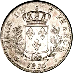 Al Dritto è raffigurato il busto del Re Luigi XVIII di Francia, volto verso sinistra. Lungo il contorno si trovano l'iscrizione circolare "LOUIS XVIII ROI DE FRANCE." e, in basso, la firma dell'incisore "TIOLIER F."; più all'esterno è presente una serie di punti. Al Verso si trova al centro lo stemma coronato della casata dei Borbone, racchiuso da una corona formata da due rami di alloro. Lungo il contorno sono presenti la scritta circolare "PIECE DE 5 FRANCS.", indicante il valore, ed in basso al centro il millesimo di conio, racchiuso a sinistra dal simbolo del direttore della zecca ed a destra dal segno di zecca, il quale può essere relativo ad una delle seguenti sedi: