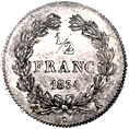 Al Dritto è raffigurato il busto coronato del Re Luigi Filippo di Francia, volto verso destra. Lungo il contorno si trovano l'iscrizione circolare "LOUIS PHILIPPE I ROI DES FRANÇAIS" e, in basso, la firma dell'incisore "DOMARD.F."; più all'esterno è presente una serie di punti. Al Verso si trova al centro l'indicazione del valore "50 CENT.", scritta su due righe con sottostante il millesimo di conio; il tutto è racchiuso da una corona costituita da un ramo di alloro a sinistra ed un ramo di ulivo a destra. In basso, al di fuori della corona, si notano i simboli del direttore della zecca e dell'incisore capo, mentre a destra è inciso il segno di zecca, il quale può essere relativo ad una delle seguenti sedi: