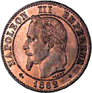 Al Dritto è raffigurato l'Imperatore Napoleone III, volto a sinistra, con sottostante il nome dell'incisore "BARRE". Lungo il contorno si trovano in alto l'iscrizione circolare "NAPOLEON III EMPEREUR" ed in basso il millesimo di conio, racchiuso tra i simboli dell'incisore capo e del direttore della zecca; il tutto è posto all'interno di una sezione circolare delimitata da una serie di punti.. Al Verso è rappresentata al centro l'aquila imperiale francese, con subito sotto il segno di zecca, il quale può essere relativo ad una delle seguenti sedi: