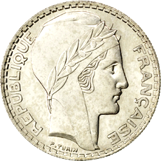 Al Dritto è raffigurata l'effigie della Marianne (simbolo della Repubblica Francese), volta verso destra, che indossa il berretto frigio. Lungo il contorno, ai due lati, si trovano le scritte ad arco "REPUBLIQUE" e "FRANÇAISE", mentre in basso si può notare la firma dell'incisore "P. TURIN"; più all'esterno è presente un motivo formato da una serie di punti. Al Verso sono rappresentate due spighe di grano, all'interno delle quali sono presenti: l'indicazione del valore "20 FRANCS" (con il numero "20" di dimensioni notevolmente maggiori) scritta su due righe, con subito sotto il millesimo di conio, racchiuso a sinistra dal simbolo del direttore della zecca di Parigi ed a destra da quello dell'incisore capo, mentre ancora più in basso sono poste le iscrizioni "LIBERTE", "EGALITE" e "FRATERNITE" scritte una sotto l'altra. Lungo il contorno è presente un motivo formato da una serie di punti.