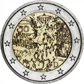 Sulla parte esterna si trovano le 12 stelle a cinque punte, simbolo dell'Unione Europea. Al Verso la nuova faccia comune delle monete in Euro, con la scritta 2 euro ed i confini dell'Europa, allargati includendo i nuovi stati aderenti all'Unione, parzialmente ricadenti su sfondo a sei linee verticali delimitate da 2 stelle ciascuna.
