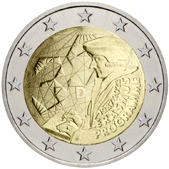 Sulla parte esterna si trovano le 12 stelle a cinque punte, simbolo dell'Unione Europea. Al Verso la nuova faccia comune delle monete in Euro, con la scritta 2 euro ed i confini dell'Europa, allargati includendo i nuovi stati aderenti all'Unione, parzialmente ricadenti su sfondo a sei linee verticali delimitate da 2 stelle ciascuna.