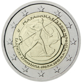 Al Dritto un soldato della fanteria dell'antica Grecia, raffigurato sulla sagoma di uno scudo e sempre sovrapposto allo scudo è rappresentato un uccello, simbolo della nascita della civiltà occidentale nella sua forma attuale. In alto, ad arco, la scritta "MAPAΘΩNAE 2500 XPONIA" preceduta dal segno di zecca di Atene (il fiore dell'Anthemion, rappresentato stilizzato). In basso, sempre ad arco, la scritta "ΕΛΛΗΝΙΚΗ ΔΗΜΟΚΡΑΤΙΑ 490 π.x. 2010 M.x.”. Sulla parte esterna le 12 stelle a cinque punte, simbolo dell'Unione Europea. Al Verso la nuova faccia comune delle monete in Euro, con la scritta 2 euro ed i confini dell'Europa, allargati includendo i nuovi stati aderenti all'Unione, parzialmente ricadenti su sfondo a sei linee verticali delimitate da 2 stelle ciascuna.
