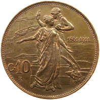 Al Dritto è raffigurata l'effigie del Re d'Italia Vittorio Emanuele III, volto verso sinistra. Lungo il contorno è impressa l'iscrizione circolare "VITTORIO EMANVELE III RE D' ITALIA", mentre in basso si trovano le firme degli autori "D. TRENTACOSTE" (modellista) e "L. GIORGI INC." (incisore), scritte una sotto l'altra. Più esternamente si può notare un motivo formato da una serie di piccoli coni. Al Verso, in primo piano, sono rappresentate due figure: davanti una figura femminile che simboleggia l'Italia e dietro una figura maschile, posta sopra un piedistallo, che simboleggia la città di Roma. Accanto alla figura femminile, sulla destra, si può intravedere un aratro ornato di fiori e frutta, mentre sullo sfondo a sinistra completa il disegno la prua di una nave mercantile. In basso a sinistra, compresa tra il disegno ed il bordo, si trova l'indicazione del valore "C•10" con sottostante il segno della zecca di Roma "R •", mentre a destra, verso l'alto, sono impressi gli anni "1861-1911". Più esternamente si può notare un motivo formato da una serie di piccoli coni.