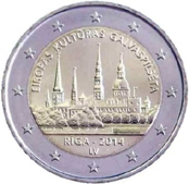 Al Dritto il panorama del centro storico di Riga, patrimonio mondiale dell'UNESCO. In alto la scritta ad arco “EIROPAS KULTURAS GALVASPILSETA”, in basso, la scritta "RIGA-2014" con sotto il segno LV indicante la nazione emittente. Sulla parte esterna le 12 stelle a cinque punte, simbolo dell'Unione Europea. Al Verso la nuova faccia comune delle monete in Euro, con la scritta 2 euro ed i confini dell'Europa, allargati includendo i nuovi stati aderenti all'Unione, parzialmente ricadenti su sfondo a sei linee verticali delimitate da 2 stelle ciascuna.