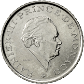 Al Dritto è raffigurato il Principe Ranieri III di Monaco, volto a destra. Sulla sinistra del Sovrano si nota la firma dell'incisore "G.SIMON". Lungo il contorno è impressa la scritta circolare "RAINIER • III • PRINCE • DE • MONACO". Al Verso è raffigurato lo stemma coronato del Principato di Monaco, con sovrapposto il monogramma del Principe Ranieri. In alto si trova l'indicazione del valore "2 FRANCS", scritta ad arco, mentre in basso è posto il millesimo di conio, racchiuso tra i simboli della zecca e dell'incisore capo.