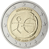Al Dritto troviamo, al centro della moneta, il disegno rappresentante una figura stilizzata che si fonde con il simbolo dell'Euro. Il soggetto è stato scelto mediante concorso online a cui hanno partecipato i cittadini dell'Unione Europea. In alto la scritta ad arco "NEDERLAND", in basso, sempre ad arco, la scritta "EMU 1999-2009". Sulla parte esterna le 12 stelle a cinque punte, simbolo dell'Unione Europea, con in basso, ai lati di una stella, il segno di zecca (a destra) e il simbolo del direttore della stessa (a sinistra). Al Verso la nuova faccia comune delle monete in Euro, con la scritta 2 euro ed i confini dell'Europa, allargati includendo i nuovi stati aderenti all'Unione, parzialmente ricadenti su sfondo a sei linee verticali delimitate da 2 stelle ciascuna.