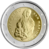 Al Dritto, al centro della moneta, è raffigurata la Madonna con Gesù bambino, particolare dell'opera "Madonna col Bambino in trono tra i Santi Giovanni Battista e Sebastiano" realizzata dal pittore italiano Pietro di Cristoforo Vannucci, detto il Perugino e conservata nelle Gallerie degli Uffizi a Firenze. Adiacenti al bordo interno, sono impresse le iscrizioni circolari "SAN MARINO" a destra e "PERUGINO" a sinistra, quest'ultima preceduta dal segno di zecca "R". In alto a sinistra, nello spazio tra l'iscrizione e l'immagine, si trovano gli anni "1523" e "2023", scritti uno sotto l'altro. Nella parte inferiore, sotto il disegno, si notano le iniziali dell'autore "MAC". Sulla parte esterna le 12 stelle a cinque punte, simbolo dell'Unione Europea. Al Verso la nuova faccia comune delle monete in Euro, con la scritta 2 euro ed i confini dell'Europa, allargati includendo i nuovi stati aderenti all'Unione, parzialmente ricadenti su sfondo a sei linee verticali delimitate da 2 stelle ciascuna.