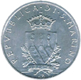 Al Dritto è raffigurato lo stemma della Repubblica di San Marino, coronato e con in basso il cartiglio con la scritta "LIBERTAS". Lungo il contorno è impressa l'iscrizione circolare "REPVBBLICA • DI • S. MARINO", mentre nella parte inferiore, al centro sotto lo stemma, si trovano le iniziali dell'autore. Al Verso, al centro della moneta, è rappresentata l'impugnatura della spada del Capitano Reggente; in basso, divisa dalla spada stessa, è presente l'indicazione del valore (L. 1). In alto, sulla destra, troviamo il millesimo di conio e a sinistra, al centro, il segno di zecca.