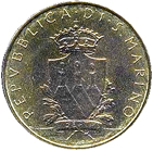Al Dritto, al centro della moneta ed all'interno di un cerchio, sono raffigurate le tre torri piumate di San Marino che s'innalzano sopra le mura, coperte a metà altezza da alcune nuvole e con il sole sullo sfondo. In basso, sempre all'interno del cerchio, sono presenti l'indicazione del valore (L. 20) con subito sotto la firma dell'incisore "MONASSI INC.". Lungo il contorno sono impressi l'iscrizione circolare "REPVBBLICA DI SAN MARINO" e, nella parte inferiore, il millesimo di conio. Al Verso è rappresentato uno scalpellino al lavoro (mestiere che i sammarinesi hanno ereditato dal loro Santo Fondatore). A destra del disegno, scritta in verticale dal basso verso l'alto, si trova la firma dell'autore "A.Berti".