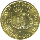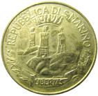 Al Dritto, al centro della moneta, è raffigurato uno stemma coronato di San Marino con le tre torri piumate, sovrapposto ad un cartiglio che nella parte destra riporta la scritta "LIBERTAS". Lungo il contorno è impressa l'iscrizione circolare "REPUBBLICA DI SAN MARINO". Sotto lo stemma, a sinistra, si trovano la firma dell'autore "J.ASSELBERGS" e il nome dell'incisore "FRAPICCINI INC.", posti su due righe. Sempre nella parte inferiore, al centro, compaiono due punti, uno dei quali divide l'iscrizione circolare nel contorno. Al Verso sono rappresentati, parzialmente sovrapposti, la bandiera della Repubblica di San Marino e una spada, simboli della Sovranità dello Stato e della sua volontà di difesa. In alto, sovrapposta alla bandera, compare l'indicazione del valore ("L. 20"), mentre a sinistra si trova il segno di zecca "R" ed in basso è presente il millesimo di conio.