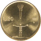Al Dritto, al centro della moneta, è raffigurato lo stemma coronato della Repubblica di San Marino, con ai lati un ramo d'ulivo (a sinistra) e un ramo di quercia (a destra). Lungo il contorno è impressa l'iscrizione circolare "REPUBBLICA DI SAN MARINO", mentre nella parte inferiore compare la scritta "LIBERTAS", compresa fra due trattini. Al Verso è rappresentata una colomba, simbolo di pace per antonomasia. Nella parte superiore sono presenti l'indicazione del valore (L.20) e la firma dell'autore "Grilli", mentre in basso si trova il millesimo di conio e sempre in basso, ma leggermente sulla destra, compare il segno di zecca "R".