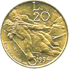 Al Dritto, al centro della moneta, sono raffigurate le tre torri piumate di San Marino che s'innalzano sulle cime del Monte Titano, a loro volta sovrastate da una corona. Lungo il contorno, in alto, è impressa l'iscrizione circolare "REPUBBLICA DI S.MARINO", mentre nella parte inferiore è presente un cartiglio con la scritta "LIBERTAS", compreso tra un ramo di ulivo a sinistra e un ramo di quercia a destra. Subito sopra il cartiglio è indicato il nome dell'autore "A.BIANCINI". Al Verso troviamo un disegno che vuole rappresentare l'intento di eliminare l'emarginazione: una figura maschile, che simboleggia un emarginato, è ritratta nell'atto di entrare da una porta che un altro uomo le sta aprendo, aiutandola a superare gli ostacoli del suo cammino. In basso, a sinistra del disegno, è presente l'indicazione del valore (L.20) con subito sotto il segno di zecca "R", mentre in basso, al centro, si trova il millesimo di conio.