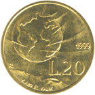 Al Dritto, al centro della moneta, è raffigurato un busto di fronte rappresentante il pianeta Terra, che tiene fra le mani una fiamma ed è circondato da corpi celesti (Luna, Saturno e stelle). Subito sotto il busto sono presenti le firme di due autori, a sinistra "G.GIULIANELLI MOD." ed a destra "F.FILANCI DIS.". Lungo il contorno è impressa l'iscrizione circolare "REPUBBLICA DI SAN MARINO", divisa a destra e a sinistra da due disegni stilizzati delle tre torri piumate sammarinesi, cinte in basso da un cartiglio con la scritta "LIBERTAS". Al Verso è rappresentata un'allegoria della Solidarietà: un globo stilizzato, con i meridiani ed i paralleli, a cui sono sovrapposte due mani che si toccano. A destra del disegno si trova il segno di zecca "R" seguito verso il basso prima dall'indicazione del valore (L20) e poi dal millesimo di conio. Nella parte inferiore, lungo il bordo, sono presenti a sinistra il nome dell'incisore "PERNAZZA INC.", scritto ad arco, ed a destra la firma di un altro autore "L.CRETARA".