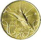 Al Dritto, al centro della moneta ed all'interno di un cerchio, è posta una rappresentazione delle tre torri sammarinesi, con le caratteristiche piume ad ornarne le punte. Nella parte esterna del cerchio è impressa l'iscrizione circolare "REPUBBLICA DI SAN MARINO", divisa a destra e a sinistra da due ramoscelli, uno di quercia ed uno di alloro. In basso, subito sopra la scritta circolare, si può notare il nome dell'autore "U. PERNAZZA". Al Verso è raffigurato un disegno dove i protagonisti sono due delfini, che simboleggiano il rispetto della Vita e dell'Ambiente. A destra, vicino al bordo, si nota il segno di zecca "R". A sinistra, all'interno del disegno stesso, è presente il millesimo di conio con sottostante la scritta "1700 d.F.R.", mentre ancora più in basso, al centro, si trova l'indicazione del valore ("LIRE" in alto ad arco e "20" subito sotto scritto con caratteri più grandi).