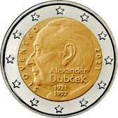 Al Dritto è raffigurato il ritratto, volto a sinistra, del politico slovacco Alexander Dubček (figura politica famosa per la Primavera di Praga, durante la quale egli, segretario del Partito Comunista della Cecoslovacchia, tentò di introdurre riforme per concedere diritti e libertà ai cittadini). A sinistra, adiacente al bordo interno, è presente l'iscrizione circolare "SLOVENSKO", mentre a destra, sempre adiacente al bordo, si trova il millesimo di conio, con sottostante il segno di zecca "MK". Sovrapposta alla parte inferiore dell'effigie, è impressa la scritta "Alexander Dubček" (su due righe e con il cognome scritto in caratteri di dimensioni maggiori), seguita in basso dall'anno di nascita "1921" e da quello di morte "1992" del politico, scritti uno sotto l'altro. Nella parte inferiore, sempre sovrapposte all'immagine e poste di fianco all'anno di morte, si notano le iniziali dell'autore "BR". Sulla parte esterna le 12 stelle a cinque punte, simbolo dell'Unione Europea. Al Verso la nuova faccia comune delle monete in Euro, con la scritta 2 euro ed i confini dell'Europa, allargati includendo i nuovi stati aderenti all'Unione, parzialmente ricadenti su sfondo a sei linee verticali delimitate da 2 stelle ciascuna.