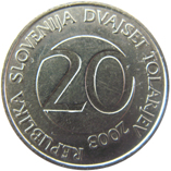 Al Dritto è posto al centro il valore 20, in incuso ed inserito all'interno di un cerchio, in basso il millesimo di conio ad arco e capovolto. Attorno al valore le scritte circolari REPUBLIKA SLOVENJIA sulla sinistra e DVAJSET TOLARJEV (indicazione del valore in lingua slovena) sulla destra. Al Verso è rappresentato un esemplare di cicogna europea, con in alto l'indicazione del valore 20 ed a destra la scritta ad arco CICONIA CICONIA, indicante il nome latino dell'animale.