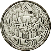Al Dritto è raffigurato lo stemma di Papa Paolo VI; lungo il contorno è impressa l'iscrizione circolare "PAVLVS VI P. M. AN. IVB. MCMLXXV" (l'iscrizione è divisa in alto e in basso dagli elementi che formano lo stemma). Ancora più esternamente si nota un motivo a forma di spina di pesce. Al Verso è raffigurata una figura maschile (di grandi dimensioni) che dorme sdraiata sopra le mura di un paese; al di fuori delle mura si notano due animali feroci (a destra un coccodrillo e a sinistra un leone) che tentano di scavalcarle, mentre in alto, è posta la mano di Dio nell'atto di benedire. Adiacente al bordo, nella parte superiore, è presente la scritta ad arco "CITTA' DEL VATICANO", mentre in basso si trova l'indicazione del valore "L. 50" con sottostante la firma dell'autore "VEROI". Più esternamente si nota un motivo a forma di spina di pesce.